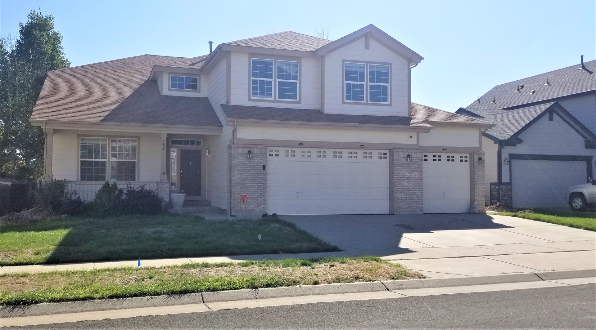 Welcome to this 2 story residence located in the Northgate Village community of Brighton, CO. This home boasts three spacious bedrooms and 2.5 well-appointed bathrooms. The house features a covered front porch, concrete patio area perfect for outdoor relaxation, and a three-car garage for ample vehicle storage. Inside, you'll be greeted by vaulted ceilings that create a sense of openness and grandeur. The eat-in kitchen is a culinary enthusiast's dream, while the formal dining room is ideal for hosting dinner parties. The home also includes a loft, perfect for a variety of uses, and a cozy gas fireplace in the family room for those chilly evenings. The flooring is a tasteful mix of hardwood in the kitchen and entry with and carpet in the living spaces, adding to the overall warmth and charm of the home. The primary bath is a 5-piece suite, offering a spa-like experience and an oversized walk-in closet the size of a room. For your convenience, the home is equipped with laundry hookups and a sprinkler system for the yard. An office space provides a perfect spot for work or study, and a full unfinished basement offers potential all your storage needs. Experience the perfect blend of comfort and style here.